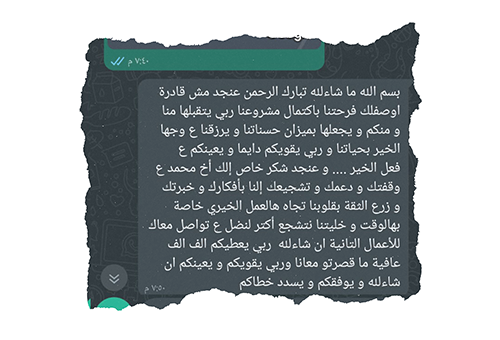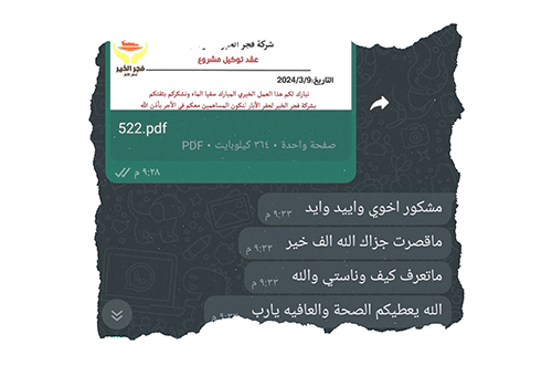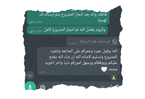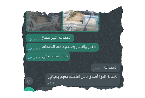 نرسل تقارير يومية تحتوي على صور وفيديوهات لكل مراحل العمل، من البداية حتى الانتهاء. بعد الانتهاء، يتم إرسال عقد الضمان للعميل مع الموقع الجغرافي (GPS) للمشروع، كما نقوم بالمتابعة الدورية لضمان استمرارية عمل المشروع.
